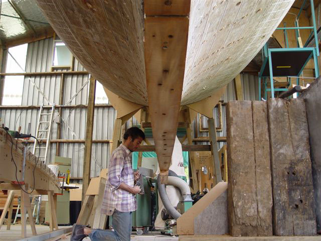Bottom of wooden keel being cleaned ready for new piece of keel