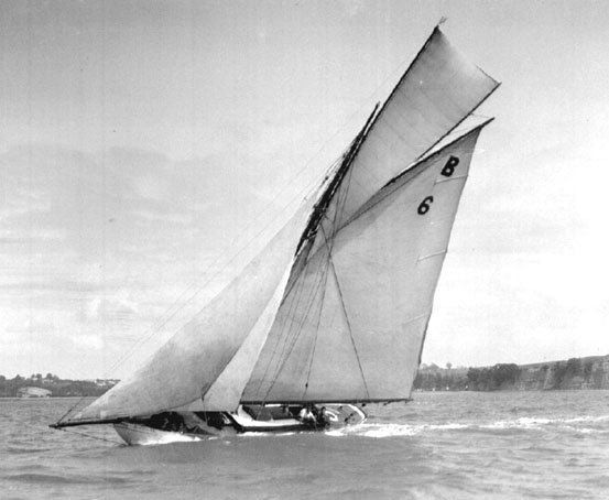 Smoking along under an early rig with a very large cornish-topsail set