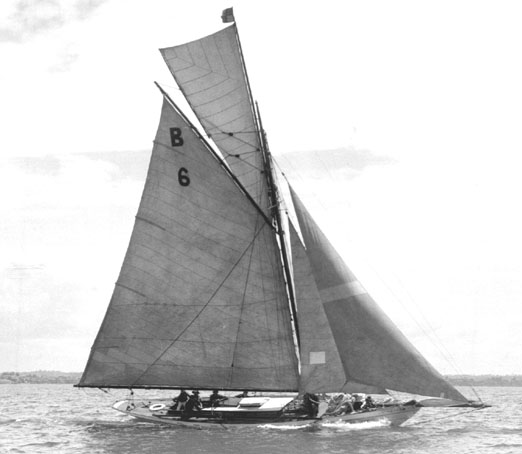 Under her early rig now showing signs of wear. The main is badly stretched and both foresails have prominent repairs