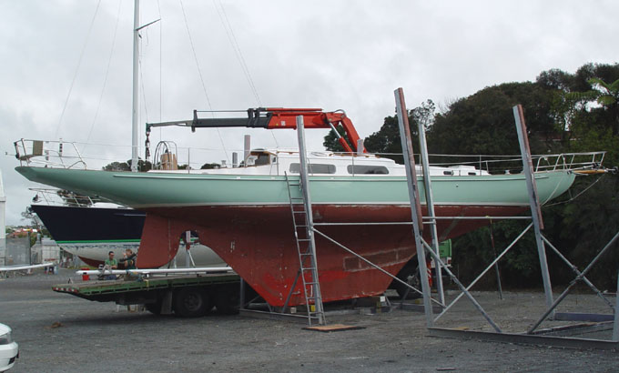 On the hard at Westpark Marina awaiting transportation to Brookes Classics boatyard