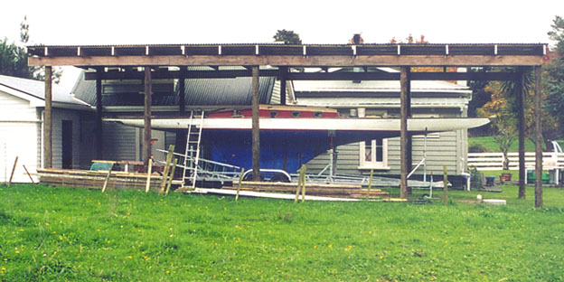After transportation across the world to 'Brookes Classic Boats' at Kumeu in New Zealand. Note the new boatshed being specially constructed for the project.