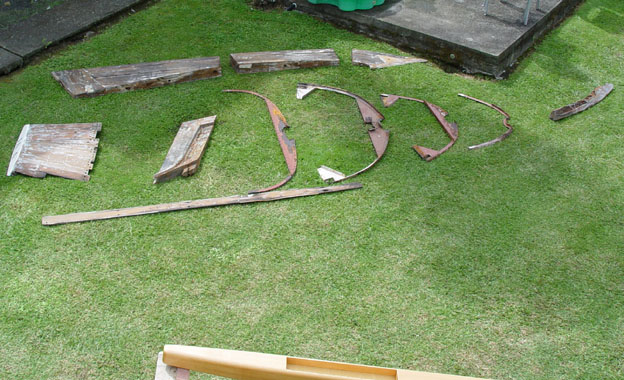 'Pieces of the old Vivi'. L to R counter-stern, stern post, steel frames, stem, with parts of the deadwood in the top background