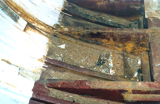 Rusted original steel frames and floors waiting to be removed carefully as patterns are made from them