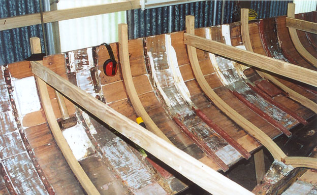 The old steel frames are being replaced by laminated wood frames with temporary frame spreaders at strategic points to hold her shape