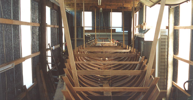Using spreaders and hangers from the boatshed the hull is now kept in shape while under construction