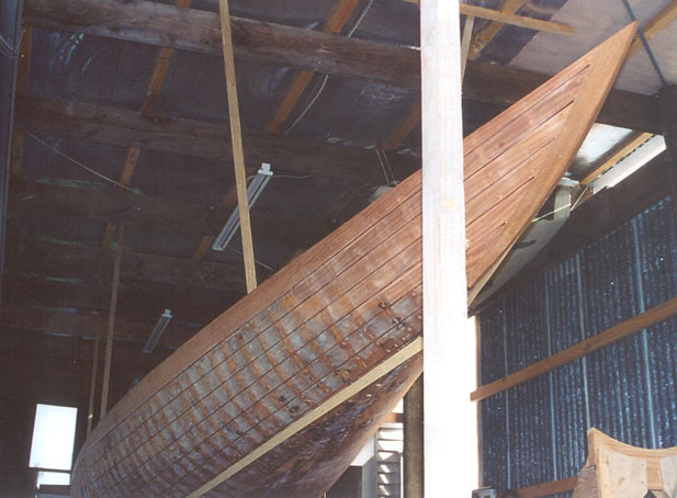 A starboard view of the completed stem and showing the planking prepared for the glueing of splines
