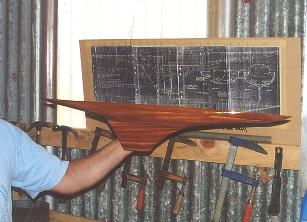 Peter Brookes holding his almost completed half-model of 'Vivi' constructed from the original drawings, to be specially presented to her owners Marcus and Megan Hutchinson