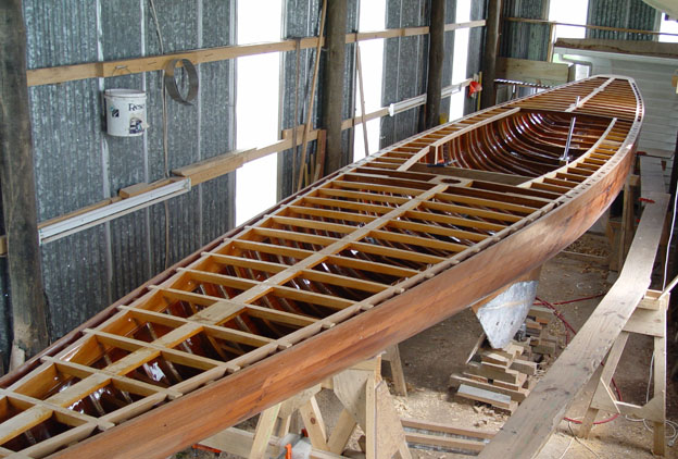 The completed hull and deck framework ready for the fitting of the deck. The whole is left in a varnished condition allowing the complete wooden structure to be permanently visible