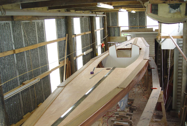 The first stage in laying the teak, it is being prepared for marking out into the shaped covering board
