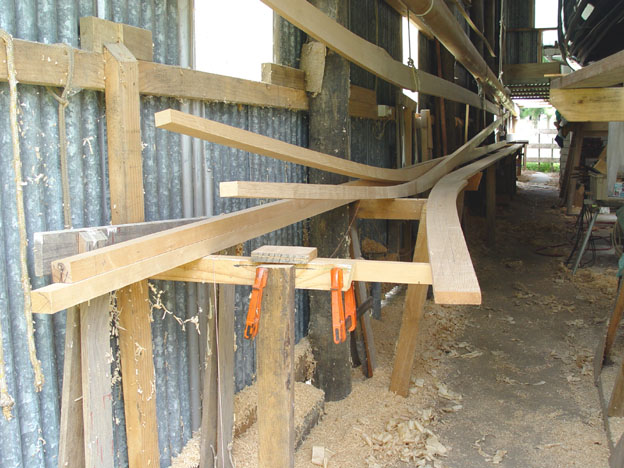 Spruce mast sections showing the top scarfed pre-bend, before assembling.