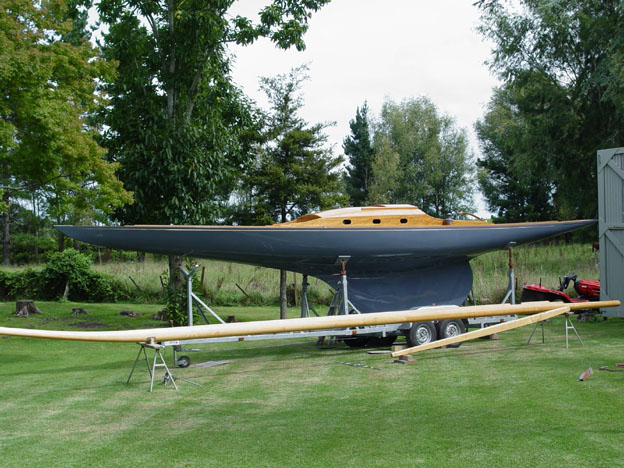 After being loaded on to her custom trailer she is hauled out of the shed ready for 'Viewing Day'. Her new wooden laminated curved mast and boom are laid on the trestles in the foreground.