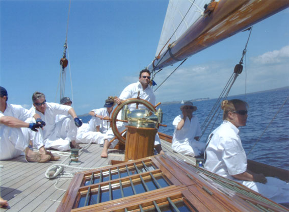 the helm of the 100ft 'Moonbeam'. 2003 |