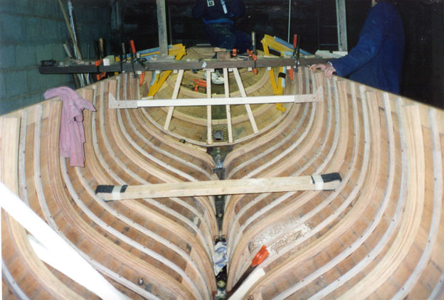 The fitting of the steamed ribs almost completed. Note the four wedges from the temporary clamped cross-bar, used to hold the rib in place hard against the hull while cooling and riveting is in progress